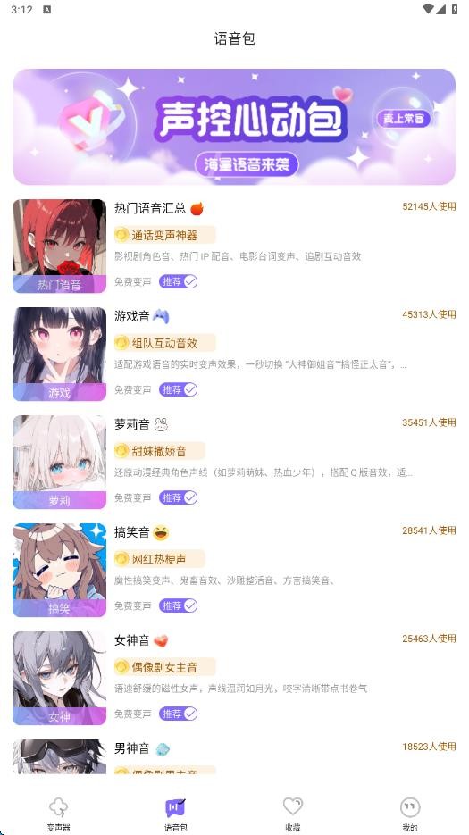5、管理个人内容,在“收藏”板块可查看收藏的语音包,“我的”板块可管理录制的文件、查看使用教程等。