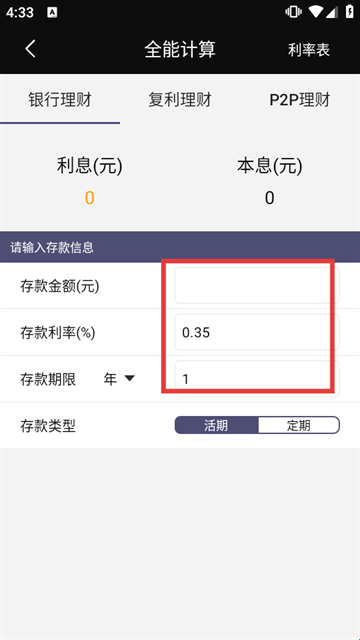 4、在利息计算页面,输存款金额、利率和期限,计算利息和本息。