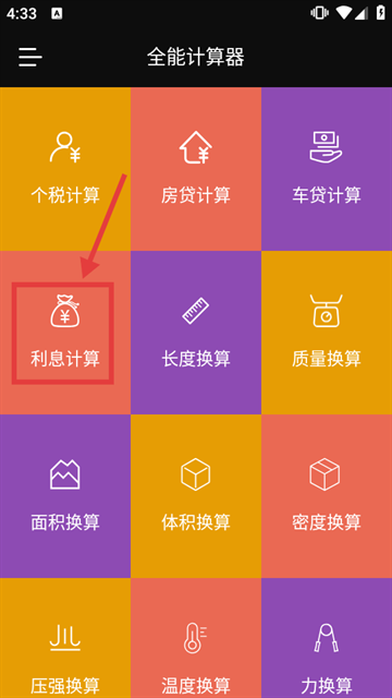 3、在全能计算器页面,点【利息计算】,进入利息计算页面。