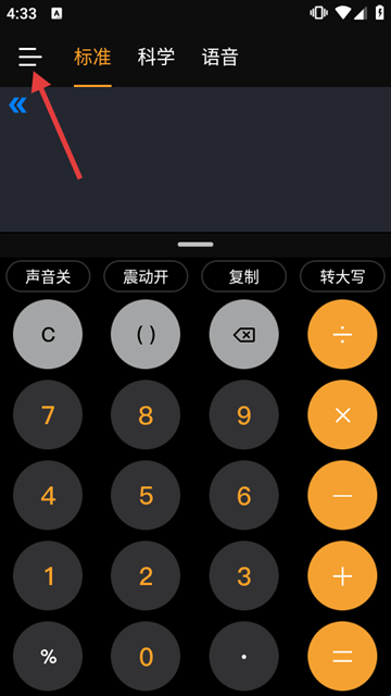 1、在计算器APP标准页面,点左上角菜单图标,展开功能菜单。