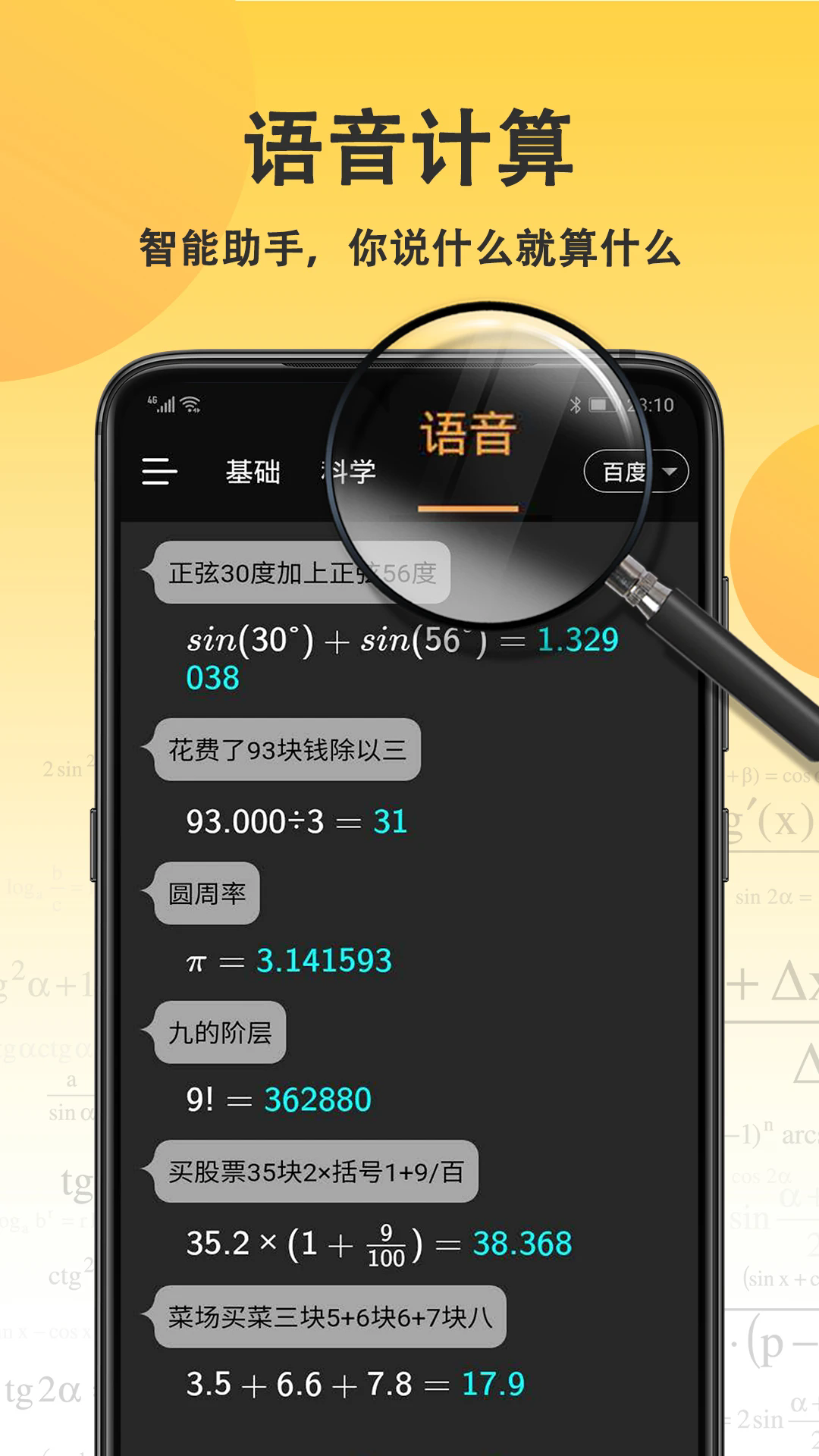 3、便捷操作:语音计算器的界面设计简洁,用户可以轻松上手。无论是简单的算术运算还是复杂的科学计算,语音计算器都能快速响应。