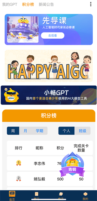 2、踏上知识的探索之旅。只需轻触底部导航栏中的“学习”选项,你的课表、学习计划以及进行中的课程便一览无余。点击“学习计划”中的“去完成”,便能即刻投身于AIGC课程的学习之中。