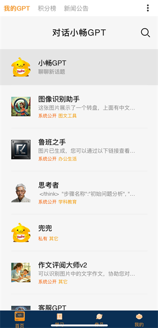 4、轻触底部导航栏中的“作品”选项,即可开启创建个人智能体的奇妙旅程。小畅GPT汇聚了上百款智能体,每一位用户都能依据自身喜好与需求,打造独一无二的智能伙伴。立即行动,开启你的智能体创作之旅。