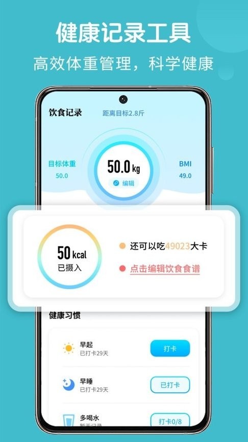 2、健康习惯打卡,支持喝水、早起、早睡等健康行为记录。
