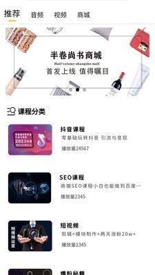 半卷尚书拥有海量的学习资源,主要为广大创业者、商家进行的培训软件,所有功能都是免费使用的,实效课程让你从小白一步步成为大神,干货满满,内置资源更新快,可以很好的满足多类用户使用需求,有兴趣的用户赶快下载试试吧!