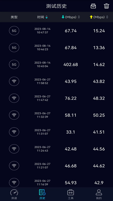 4、点击首页右上角的三条杠,可以看到我们每次测速的结果,测试的时间都有显示,这个还是很方便的。