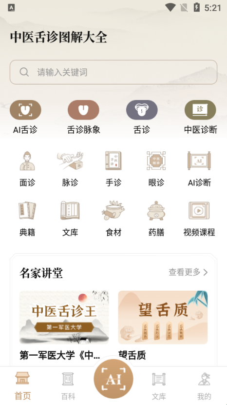 1.首页功能:进入首页后,可以看到多个功能选项,如 AI诊断、百科、文库等。