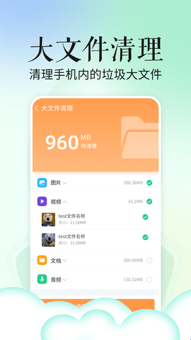 2、大文件清洁支持:帮助各位可以快速的查询手机中的文件进行清洁;