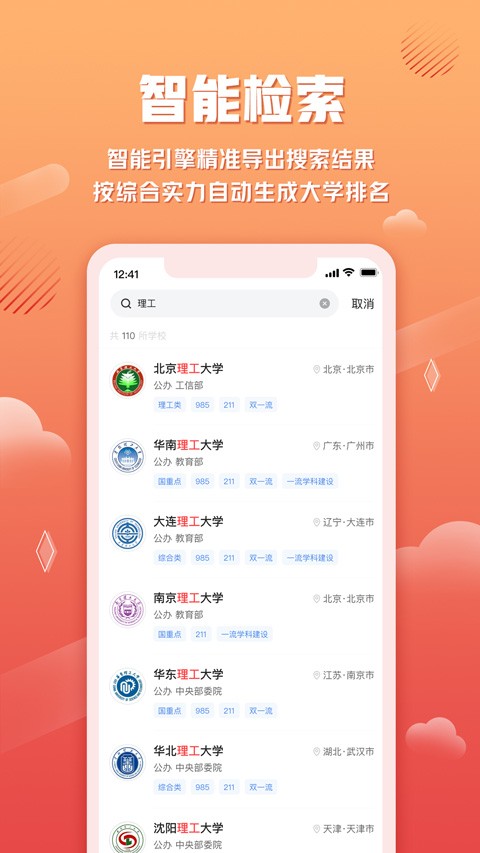 3、智能检索:智能引擎精准导出搜索结果,按综合实力自动生成大学排名。