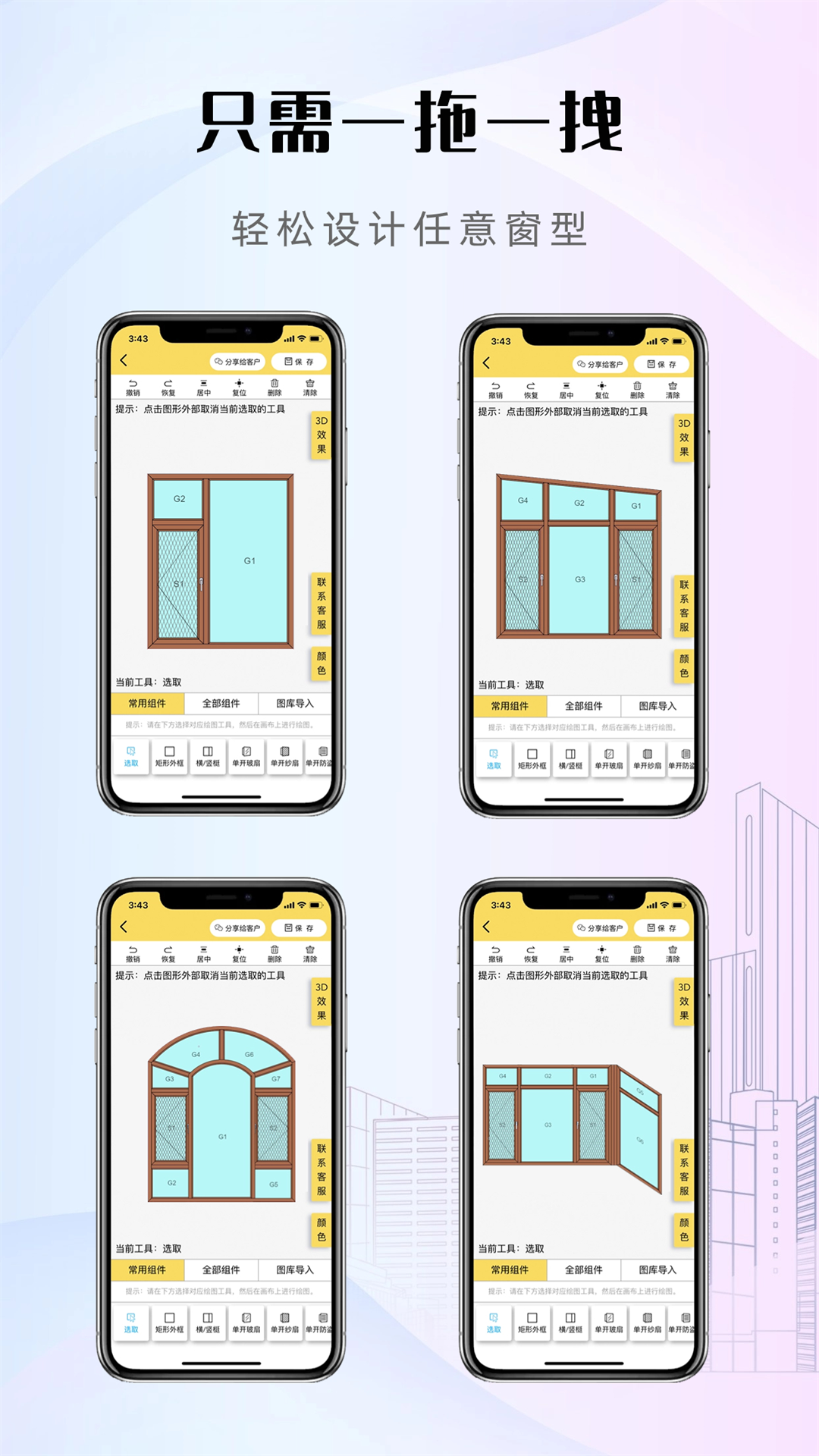进入软件中就可以运用强大的绘制工具轻松绘制各种各样的图案,帮助用户高效解决个人设计门窗的难题,在运用各种绘制工具时能够通过简单的操作流程帮助用户轻松完成图案的绘制工作,在这里不仅能够让用户高效减轻个人的办公压力,及时解决问题,还可以让用户随时随地利用个人的碎片化时间完成设计工作,提高办公的效率以及质量;易绘门窗免费版还具备了丰富多样的素材资源,比如型材、地板、玻璃、门窗、背景等多种多样的素材都能够随意运用,让完成的设计工作更加精致,满足客户的需求,有需要的用户快来试试吧。
