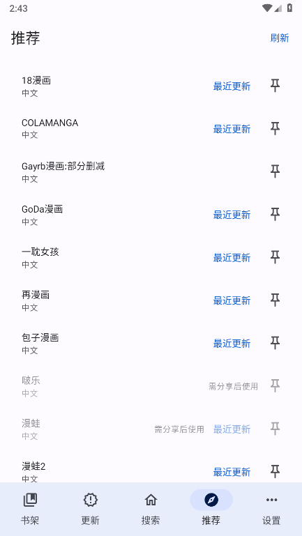 我们只需要找到底部的【推荐】功能栏就行,这里内置了超多其他漫画的阅读源,无需导入,自由使用。
