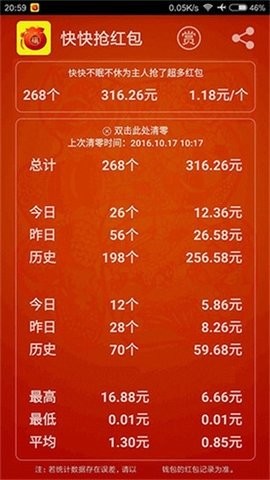 3、支持红包金额、个数统计。今日,昨日,历史抢到红包个数、金额,一目了然,随时分享战果
