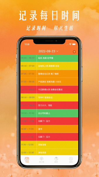 34枚金币时间app是一款时间管理软件。记录你的一天在不同事件上耗费的时间,生成统计,根据app建议可以调整自己的生活规律,每一种事情都会按照五种颜色进行标记,五种颜色代表你对时间的利用效率以及不同状态。提升时间利用效率,管理好时间!