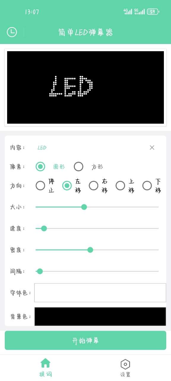 是一款模拟led的手机弹幕工具,用户可以自由设置弹幕的内容、方向、移动速度、字体大小等等,软件还支持自动记录弹幕历史,下次需要使用时直接从历史记录点击即可,为用户打造功能全面的led的手机弹幕软件。