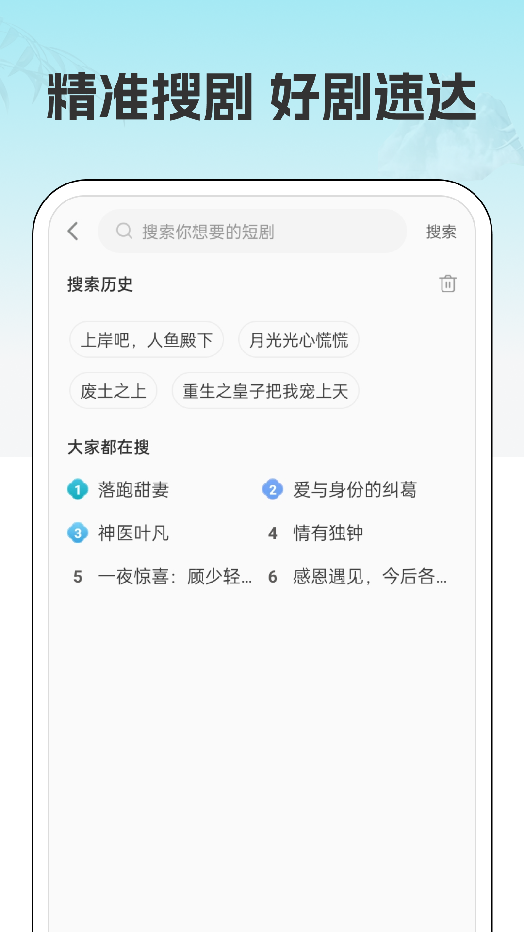 1、支持通过关键词搜索想要观看的短剧,搜索历史会被记录,方便再次查找,同时展示热门搜索内容。