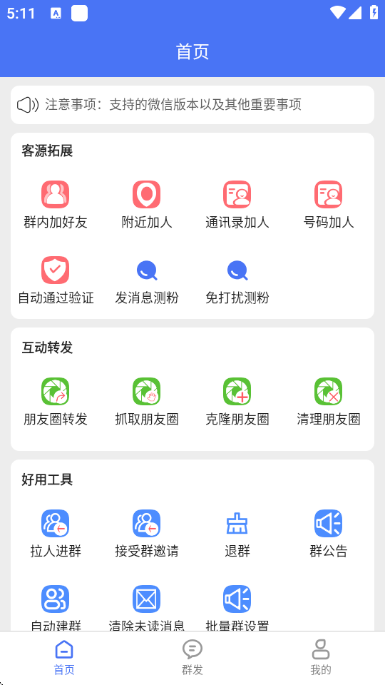 微商助手专业版是一款帮助微商用户进行营销宣传的辅助性工具,这里有很多实用的功能,包括客源拓展、互动转发、好用工具,可以进行各种方式加好友,还可以进行朋友圈转发、克隆、抓取,还可以拉人进群、接受群邀请,自动建群、退群等等,需要的用户快来下载吧。