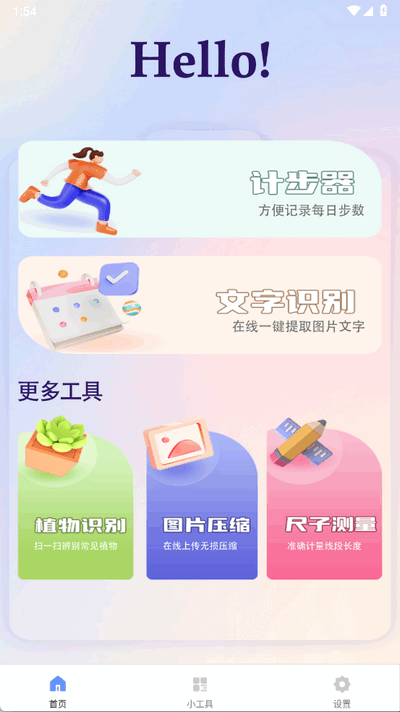 1、功能丰富多样:涵盖计步器、文字识别、物品识别、图片压缩、尺子测量、格式转换等实用小工具,还包括手电筒、扫描识别、字体大小设置等功能,能满足日常生活、学习、娱乐、工作等多方面的需求。