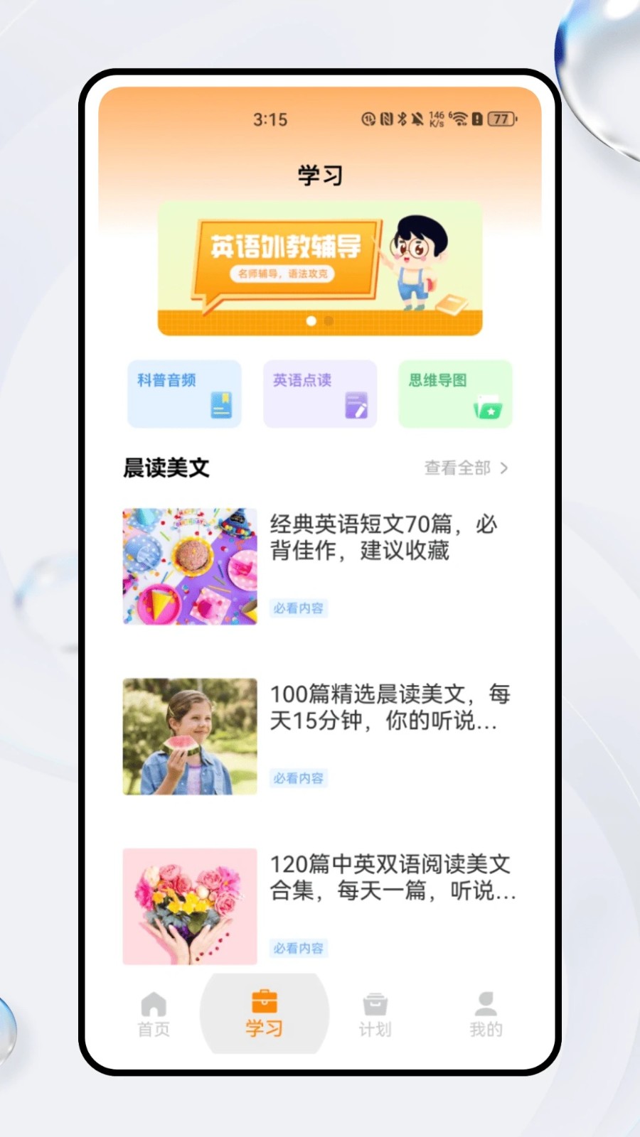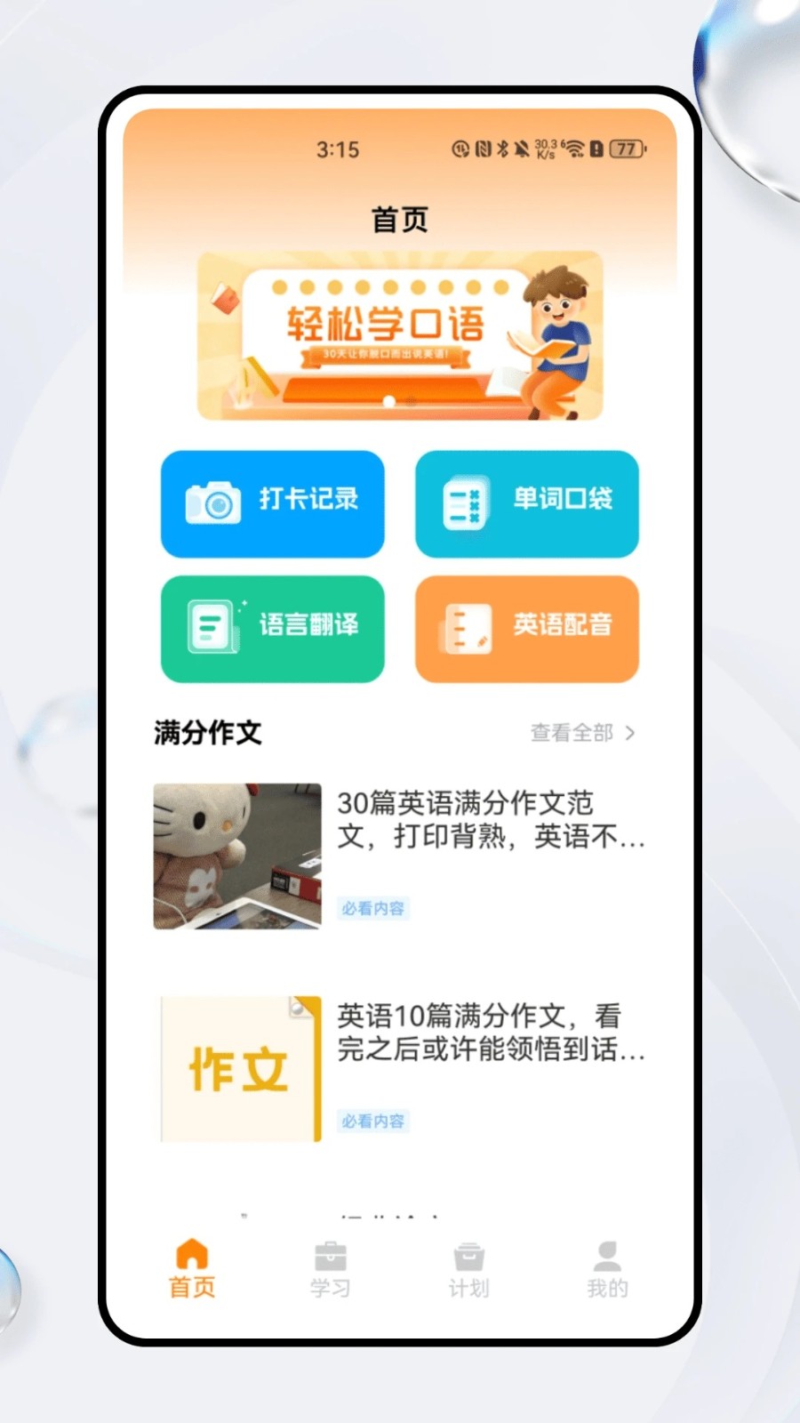你的专属英语成长加速器!每日打卡养成习惯,单词口袋智能巩固词汇,语言翻译+配音实战口语;学习页科普音频拓宽视野,点读功能精听纠音,晨读美文培养语感;计划页科学规划记忆训练,外刊精读提升思维,定制专属学习路径。从基础积累到高阶突破,沉浸式场景覆盖听说读写,让英语学习像吃芝士一样轻松有趣!