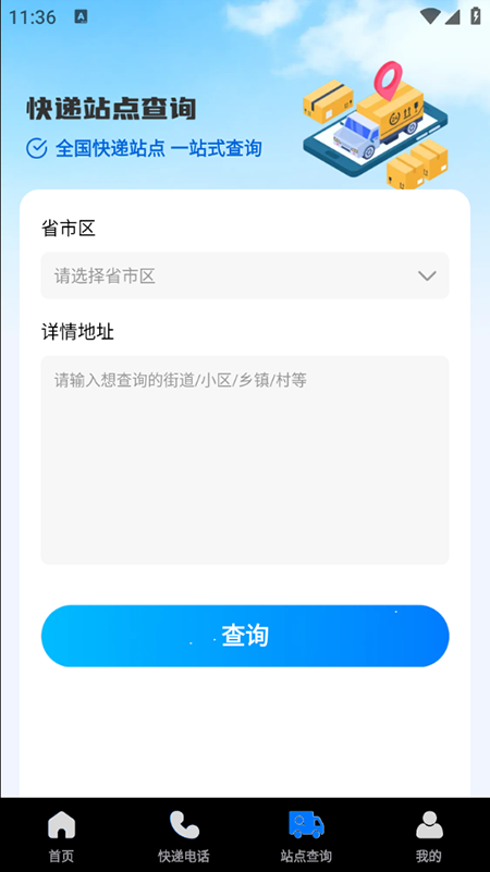 附近网点查询功能,软件自动为用户定位当前位置附近的快速网点,快速战快递员拿包裹。