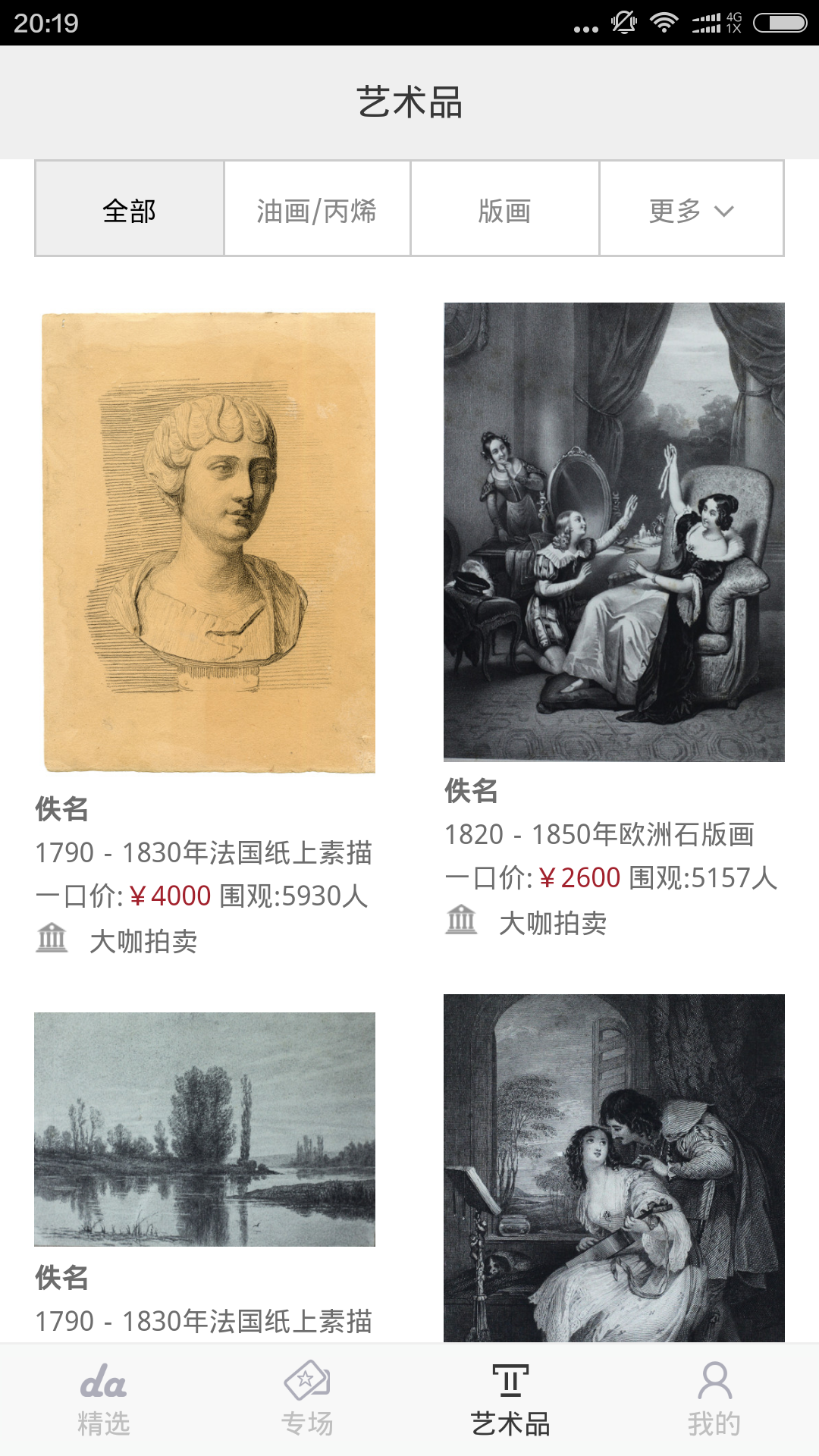 大咖拍卖app为您提供最大的艺术品拍卖交易平台,该应用由北京智艺文化艺术有限公司进行发布和推广,应用内主要拍卖方式为同步直播拍卖,其中拍卖内容大多为独创高价值的新型艺术产品或者大量独立艺术团体产品,受到广大收集者的喜爱。