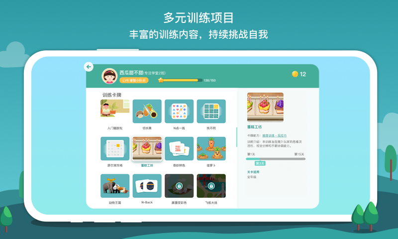 4、APP每日推送个性化定制的训练内容,经过坚持训练可以有效改善大脑底层注意力水平和核心执行功能。