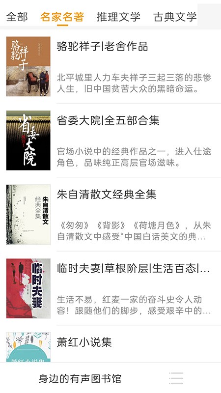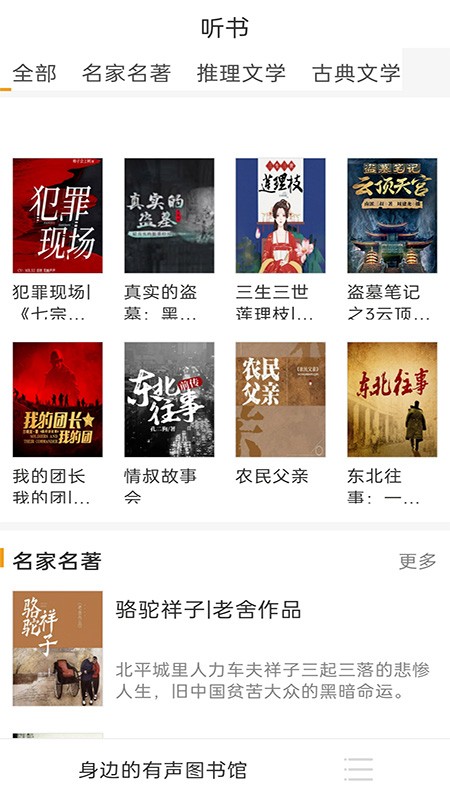 免费有声听书大全是一款满足用户听书要求的听书软件,里面有各种类型的小说资源,无论是网络小说,亦或是世界名著,在这里都可以找到,还可以选择不同的音色,不同的播放速度等等,界面简洁大方,操作简单不复杂,功能齐全,喜欢的用户快快来下载吧。