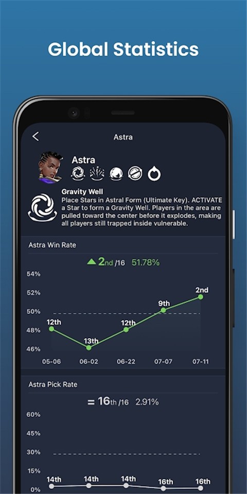 查看任意地图或排行榜每个Valorant特工的全球洞察数据,如每个人的胜率。您还可以详细查看他们的统计数据(包括逐渐升高的KDA或选择率)。