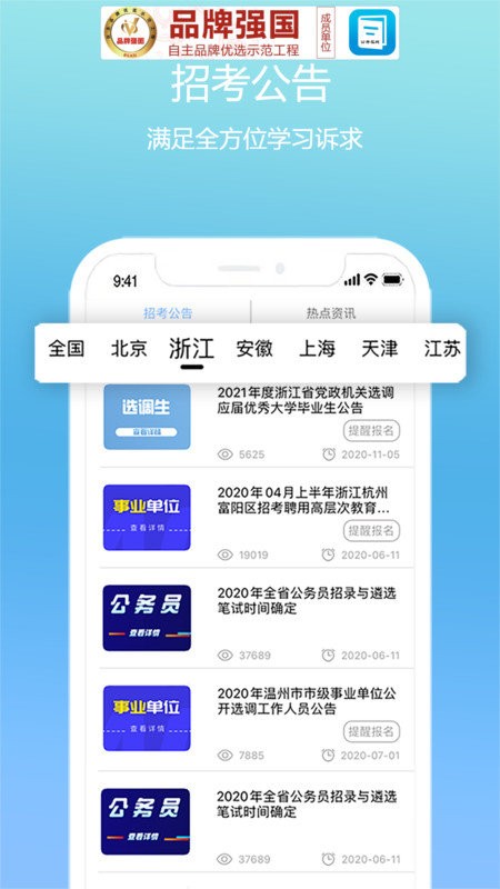 国内领先公职考试备考APP,专注于公职培训,主要分为:一、招考公告,及时更新全国公职类招考信息,二、热点资讯,主要社会热点整理,如:半月谈、人民日报评论、光明日报等主要刊物整理,涵盖了公务员、事业单位、教师等热门考试,为考生提供优质、高效、个性化的在线学习。功能也很全面,大家可以随时登陆进行学习,板块内容多,助大家轻松过关。
