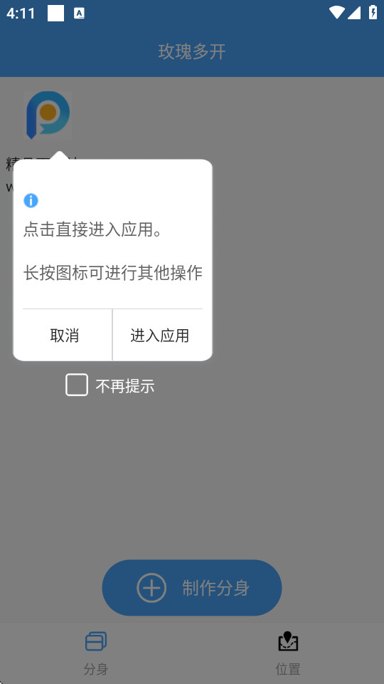 玫瑰多开是一款能够在同一部手机同时打开应用多个账号的分身工具,可以实现应用多开的功能,抖音、快手、王者荣耀、和平精英等热门软件和游戏都可以用该软件进行应用多开,界面简洁,操作方便快捷,是生活中的得力助手,需要的用户快快来下载吧。