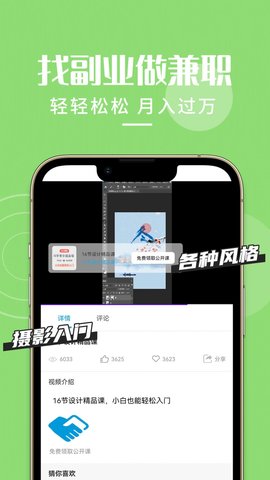 2、支持美图、调色、文字特效、手绘教程、图片合成以及抠图等多种教程
