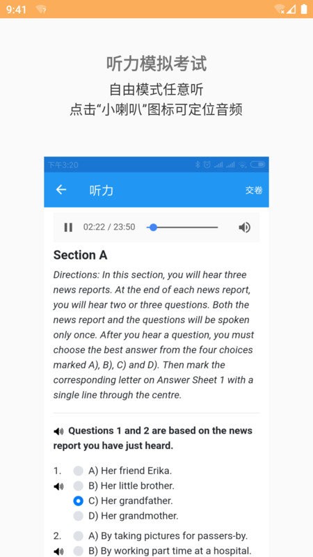 严格模拟考试:禁止长按查词,不可调整音频播放进度,播放结束后自动交卷。