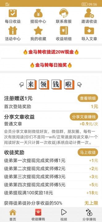 6.金马转app多样的玩法,选择性多,阅读,转发朋友圈,广告推广都可以。
