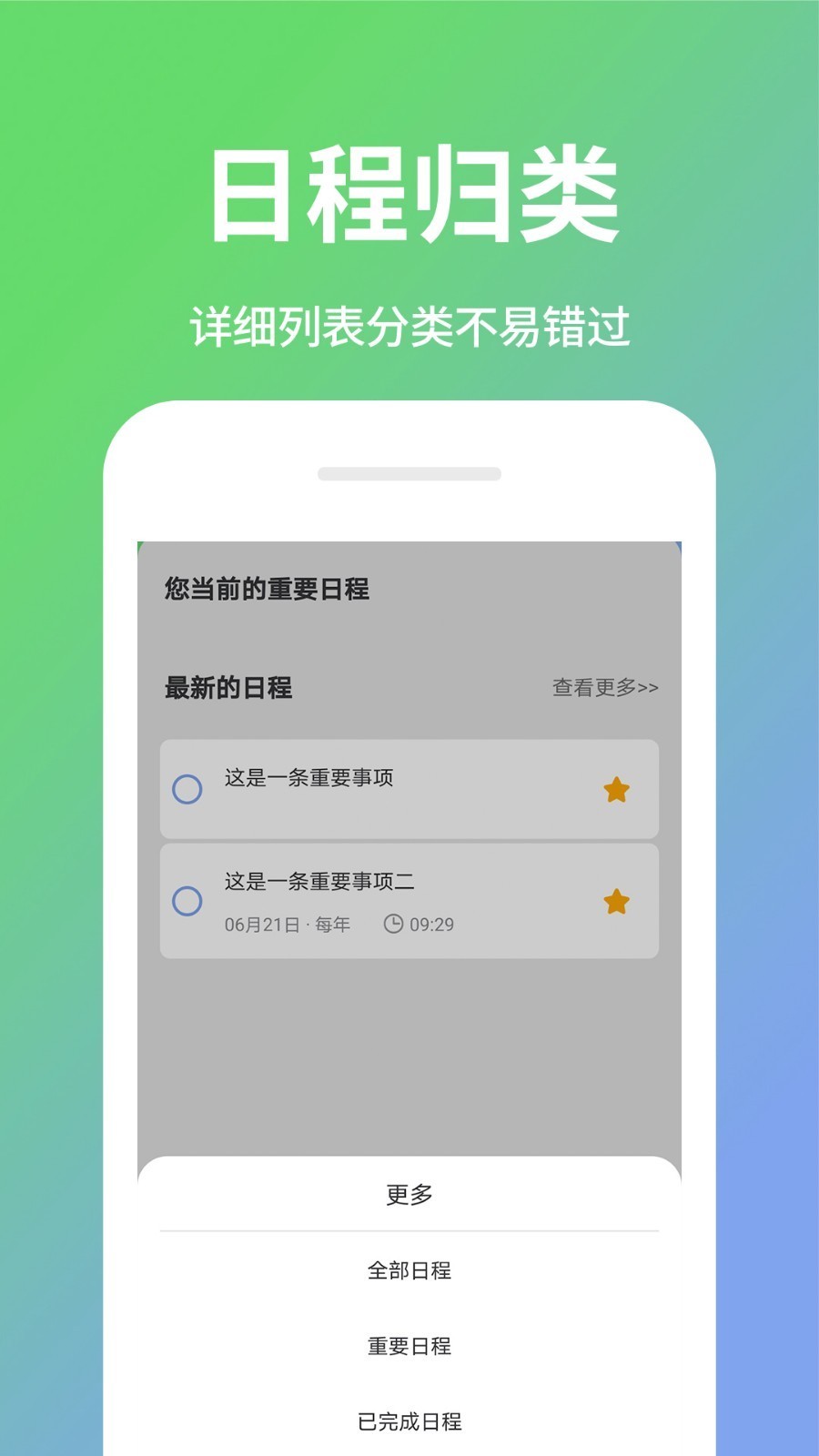 全新界面上线日程计划清单,行程助手好拍档,管理好你的每个日程和计划,随时随地确认日程表和时间表,不管你要去哪儿,做什么任务,都能提前在应用内轻松完成日程安排日程计划清单功能完善,涵盖了用户需要的纪念日提醒、日程提醒事项、任务清单、时间管理、日程管理,掌控生活,如此美妙,不再担心错失任何的日程计划和提醒事项