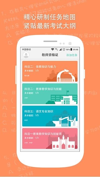 告别传统枯燥的学习方式,“一起考教师”的闯关游戏让你停不下。轻松学习,任务通关,考试原来这么简单。