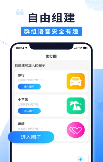 1、能够组建自己的小圈子,和圈子里面的好友共享地址,实时语音交流;