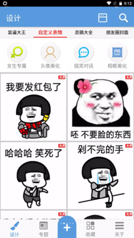 3,收藏设计,发挥创意,用户在软件中可以随时来讲各种不同类型的素材模式进行创意的发挥和构建,制作出更加精美的表情包,管理文字以及效果,制作更完美。