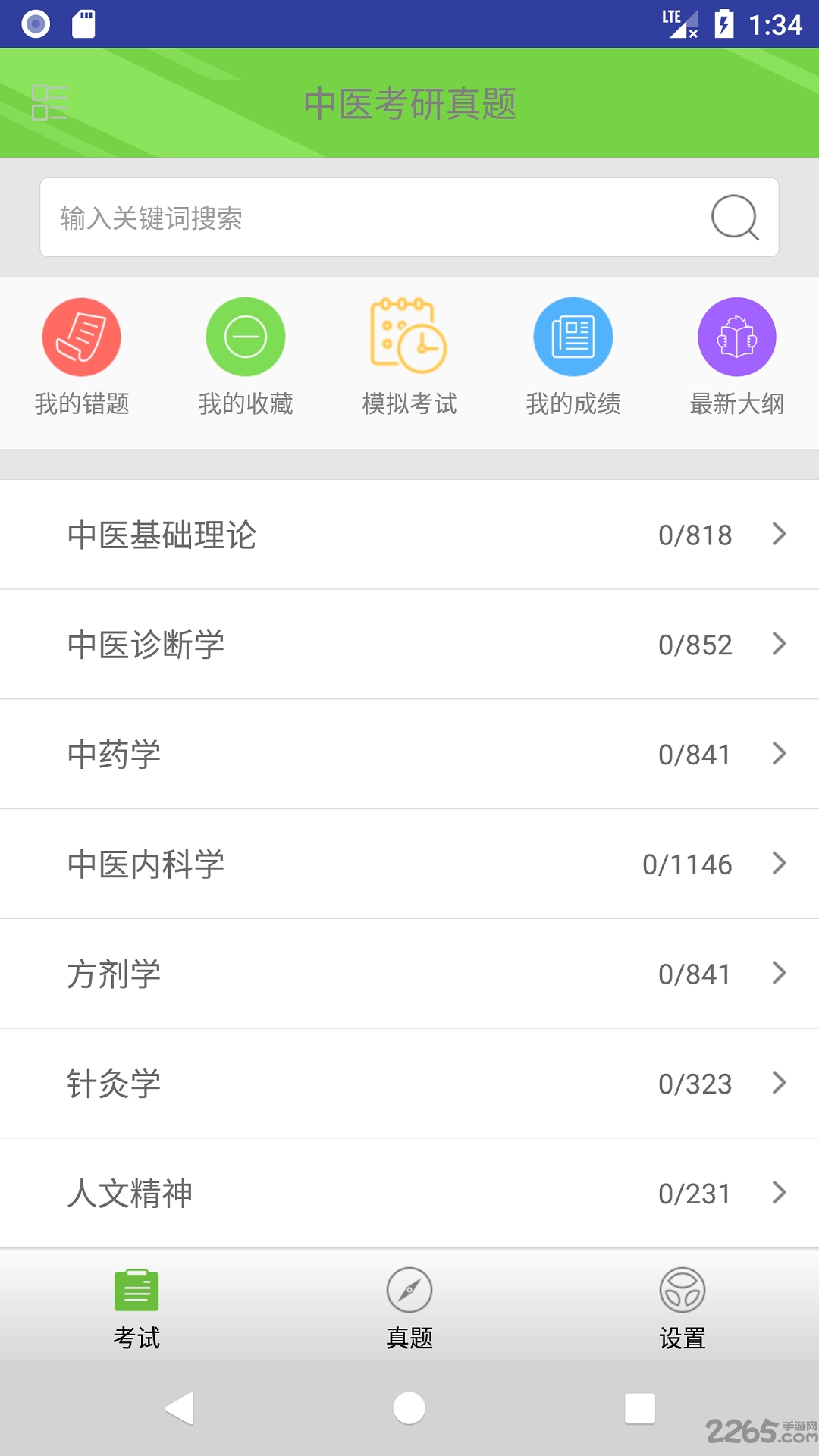 1、打开中医考研真题app完成注册,在首页选择中基、中诊、中药等专业科目进入对应的题库模块。