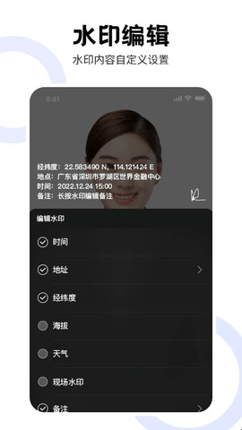 3、水印可自动更新为实时记录、时间、地点、经纬度、海拔等水印。
