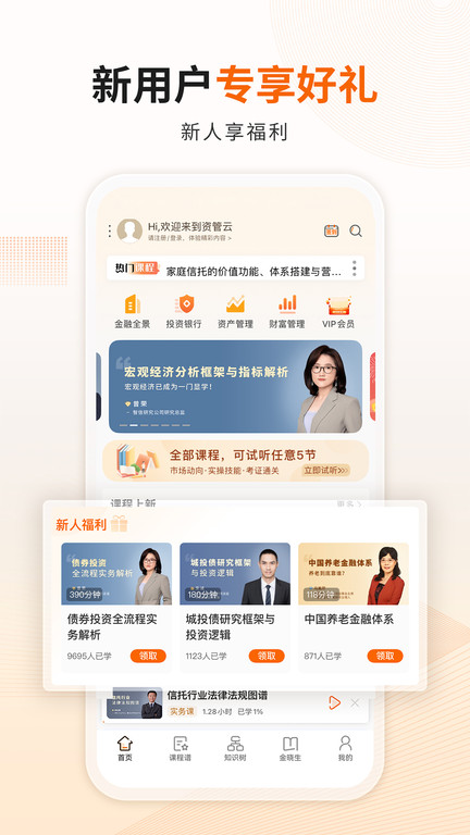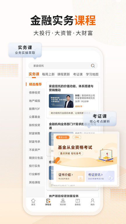 1、打开资管云课程app完成注册登录,在首页浏览金融知识树或直接搜索你需要的课程方向,如资产管理或投资银行等。