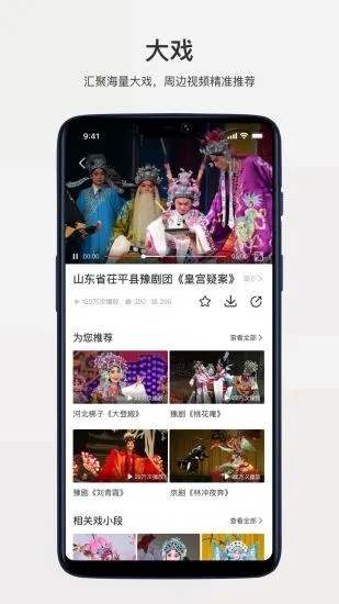 【大戏】智能推荐,只给你想要的,大戏介绍更全面,展示形式更多样,汇聚海量大戏曲目。用户还可自主上传大戏,赚取收益。