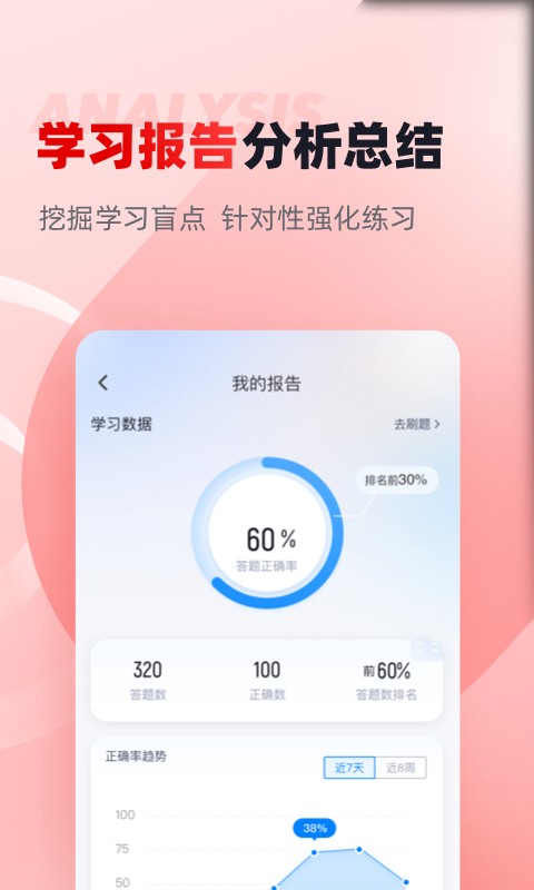 4、考前提升:成绩单实时记录考试数据,一点一滴的反馈考生近期学习状态以及自我正确率的提升,大大的给予考生通过考试的信心。