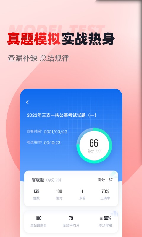 2、高质量的模拟考卷:题库新增模拟考试功能,三支一扶可按照自我练习的考点选择相对应的模拟试卷,也可选择搭配好的模拟整卷考试。