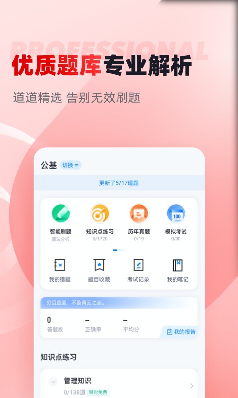 3、多样式的刷题模式:题库内含考点练习,全国通用卷以及地区卷模拟练习,以及按照固定考试比重的随机式的抽题的真题考场。