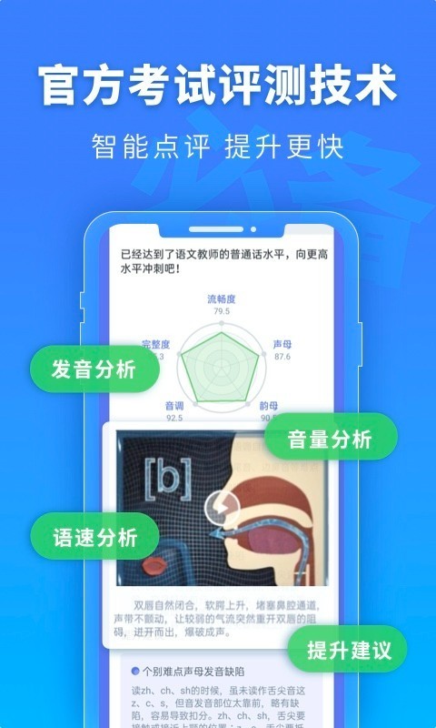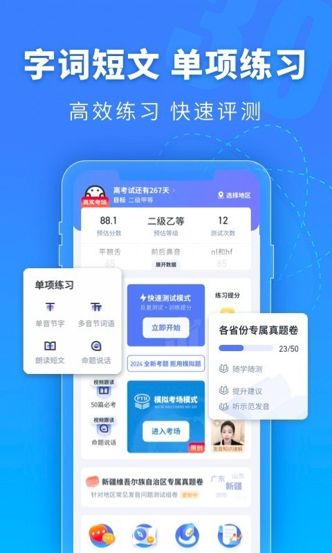 普通话水平测试app是一款可以帮助用户们检测普通话水平的软件,大家可在线上体验真实的考试模拟非常的方便,还有一些相关的智能检测服务功能,并根据测试结果为用户普及语音知识,欢迎大家来下载使用吧