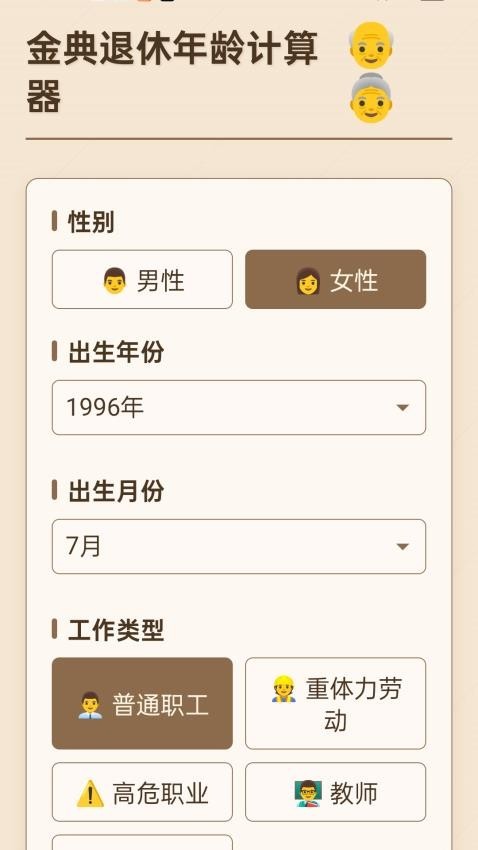 5、可以输入出生年份、出生月份、选择工作类型即可一键计算出你的退休年龄;
