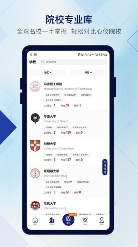 可以获取全球各大院校的资料信息,在平台用户可以查询不同院校的详细资料;