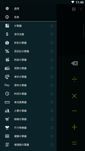 多功能计算器app号称国内手机计算器领域最强大的计算机应用工具,除了传统的加减乘除计算器外,它还支持货币、兑换、折扣计算器、利息计算器、贷款计算器、单价计算器、周年计算器、时间计算器、单位换算器、小费计算器、购物计算器、尺寸转换器、健康计算器、号码转换器等十五项实用工具,并支持所有手机/平板设备,轻松满足绝大多数用户的计算需求。另外,多功能计算器安卓版还包含了记录每次计算的过程和结果、切换日光夜间模式等特色功能,新版本更是添加高级功能已解锁,无需Google Play服务和禁用/删除不需要的权限+接收者和服务等优化,给予用户更好地体验!