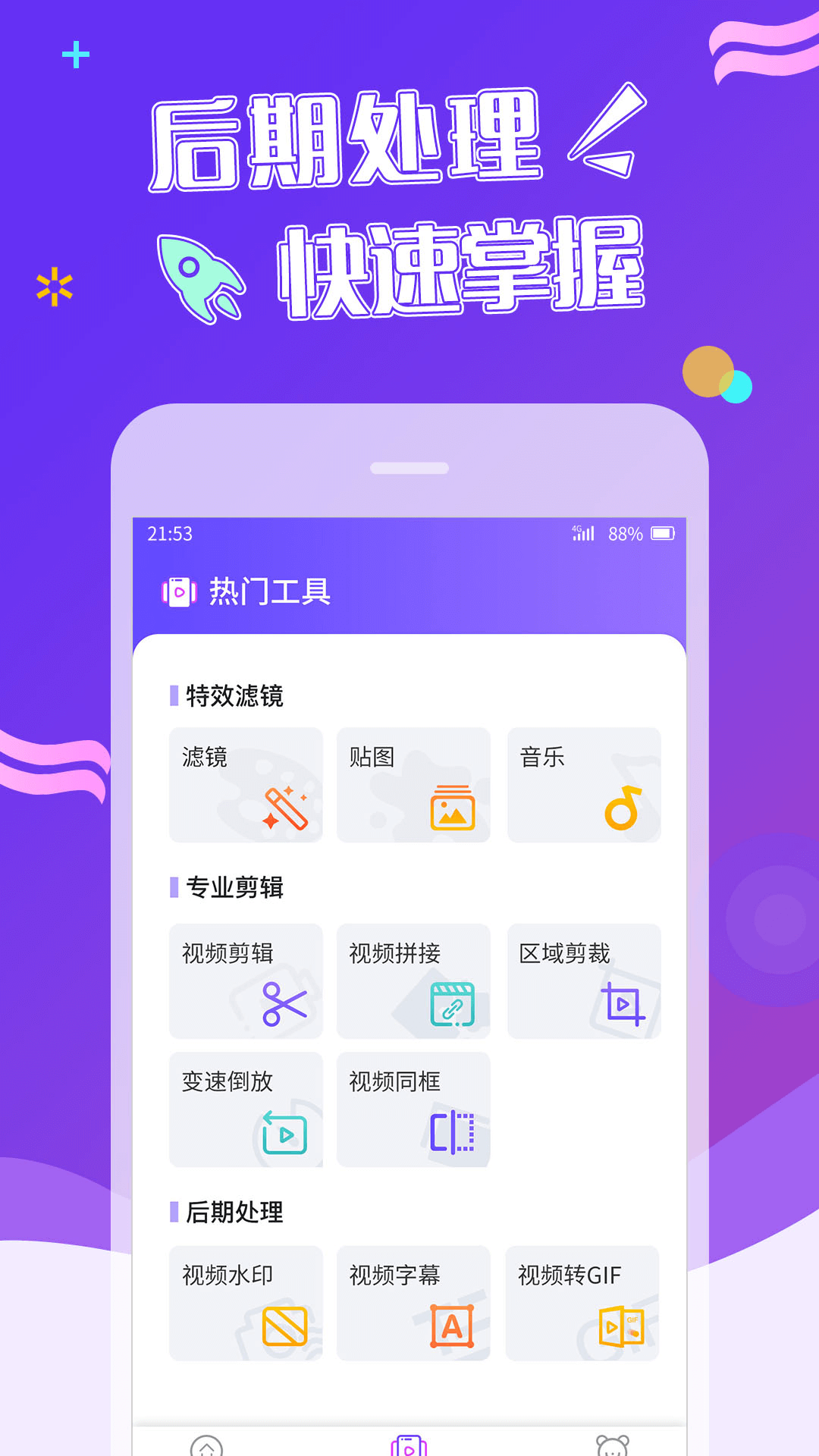 3、视频拼接、区域裁剪、变速倒放、视频同款等各种专业视频剪辑功能,几秒就能学会轻松入门成为视频剪辑达人。