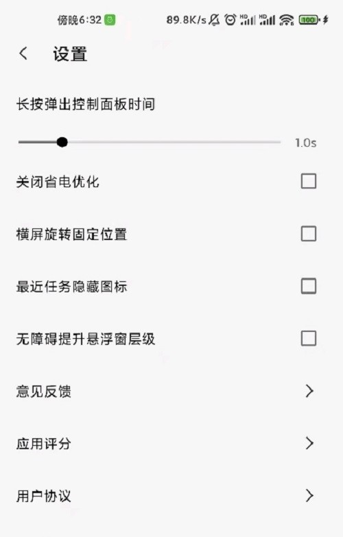 工具设置里,拖动滑块可以调节长按弹出控制面板的时间,如果你想永不弹出,直接滑动到最右边即可。