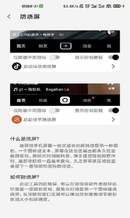 2、防烧屏:能够在启动抖音、快手等前启动阴影悬浮窗,遮挡易烧屏区域,降低屏幕烧屏风险。